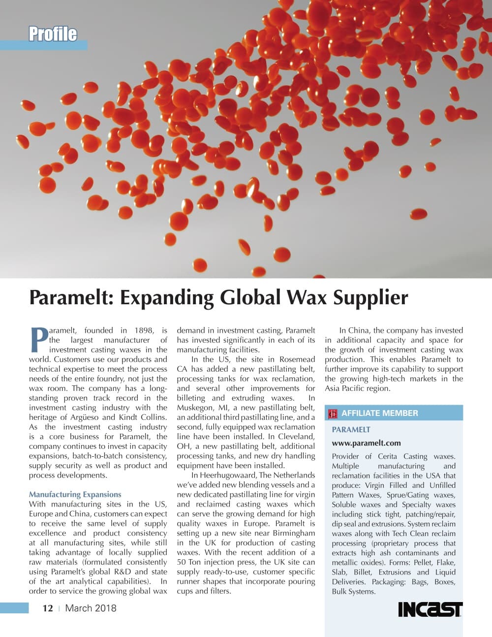 As the investment casting industry is a core business for Paramelt, the company continues to invest in capacity expansions, batch-to-batch consistency, supply security as well as product and process developments.